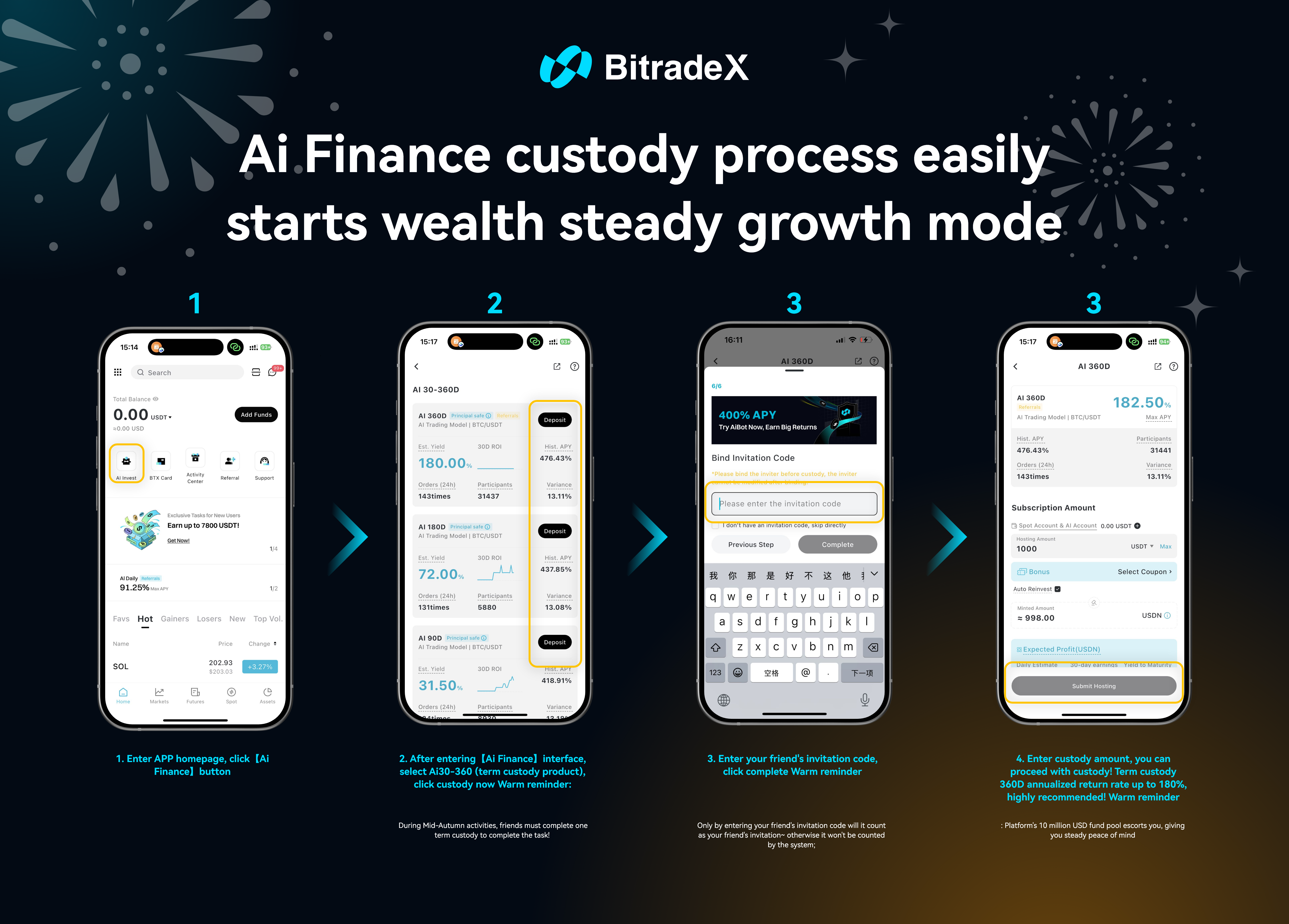 - Ямар нэгэн хууран мэхлэх үйлдэл (хуурамч хэмжээ, худал урилга гэх мэт) байвал эрх чөлөөг нь хасна. Эцсийн тайлбарын эрх BitradeX платформд харьяалагдана.
