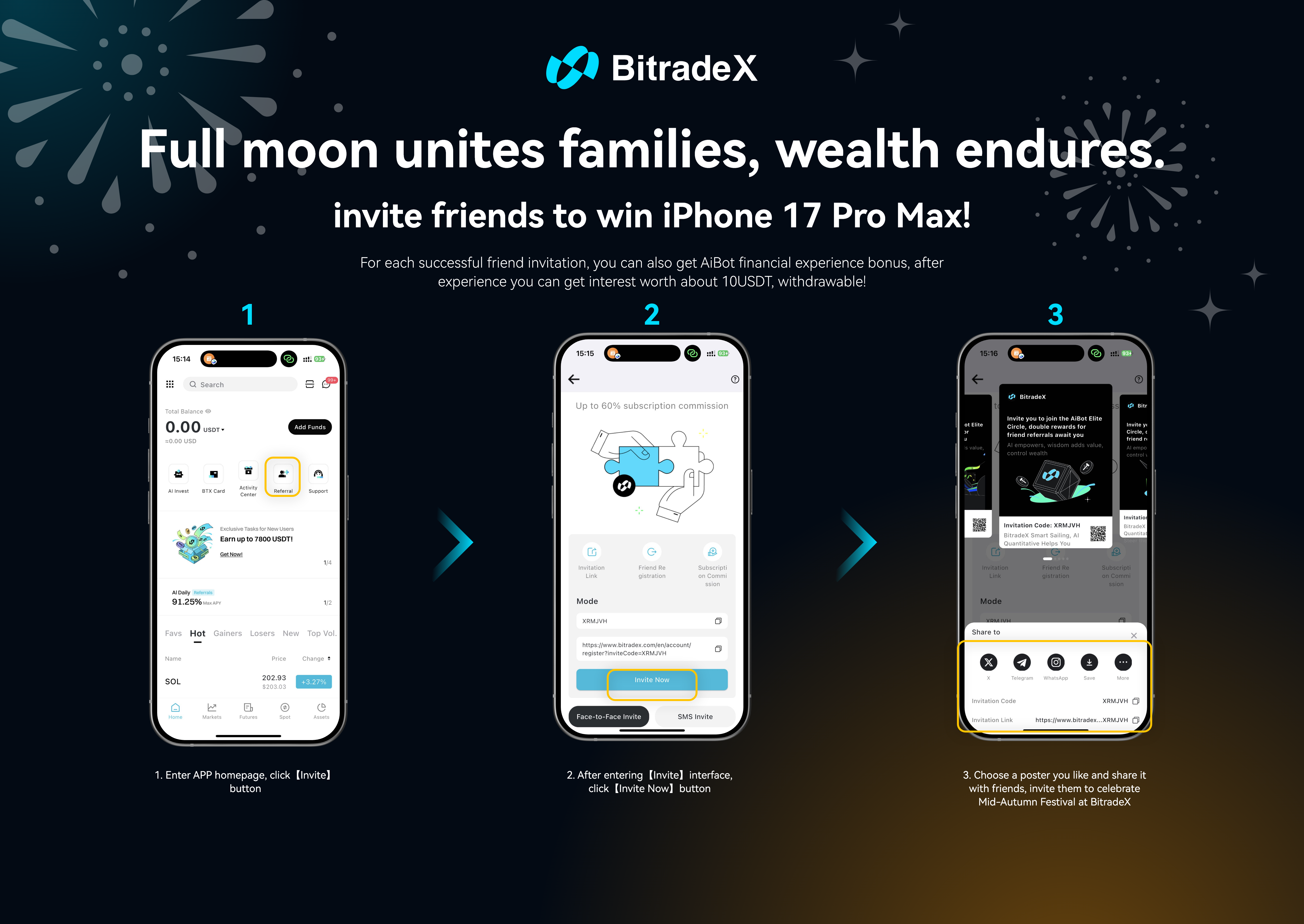 Bulan penuh membawa reunian, berkongsi hadiah indah bersama. Kami dengan ikhlas menjemput anda untuk mendaftar di platform BitradeX bersama rakan-rakan untuk peluang memenangi iPhone 17 Pro Max dan pelbagai ganjaran mewah!