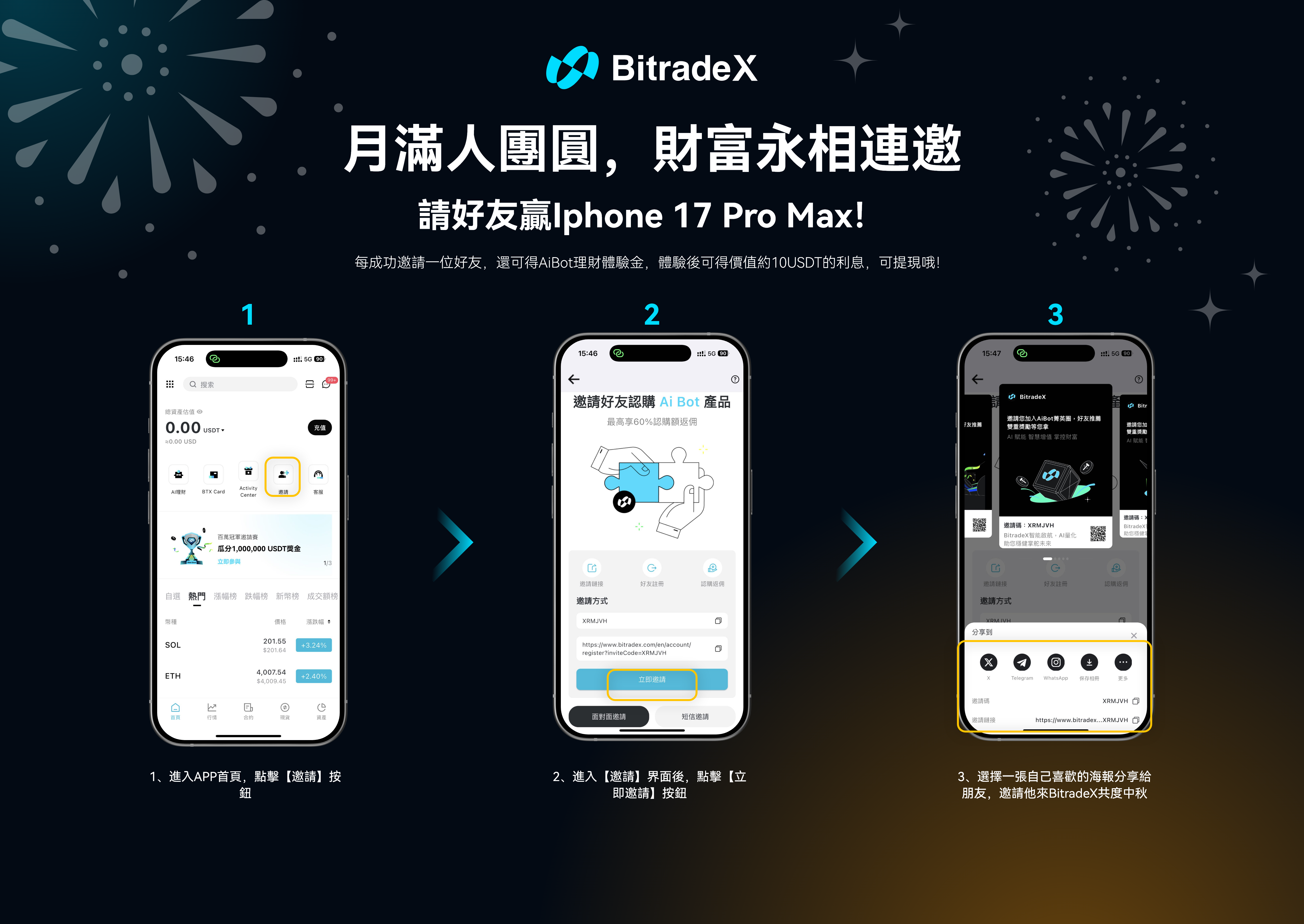 月圓人團圓,好禮共分享。誠邀您攜手好友註冊 BitradeX 平台,即有機會贏取 iPhone 17 Pro Max 及多重豪華禮遇!